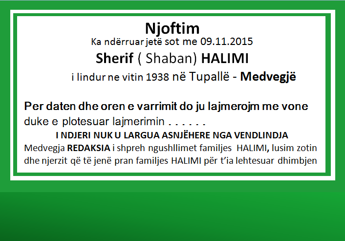 Medvegja REDAKSIA i shpreh ngushllimet familjes HALIMI, lusim zotin dhe njerzit që të jenë pran familjes HALIMI për t’ia lehtesuar dhimbjen.