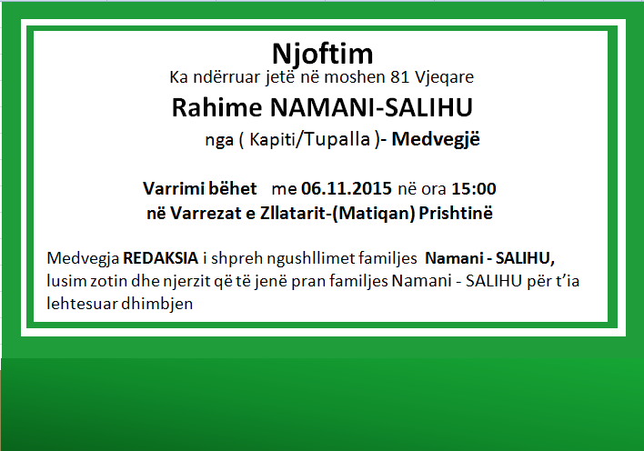 RELIGJION Ka ndërruar jetë Rahime NAMANI-SALIHU nga Medvegja 05/11/2015 tupalla Laisser un commentaire Rahime (Fetah) NAMANI-SALIHU nga ( Kapiti / Tupalla )- Medvegjë